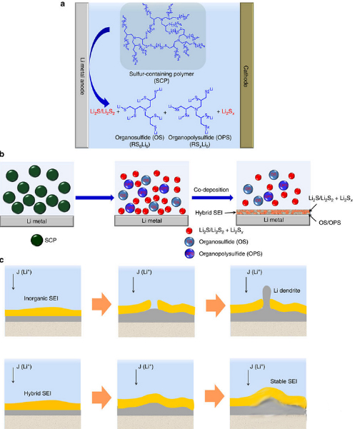 a) SCP提供電解質(zhì)中的有機單元(多硫化物/多巨硫化合物)和無機單元(Li2S/Li2S2);