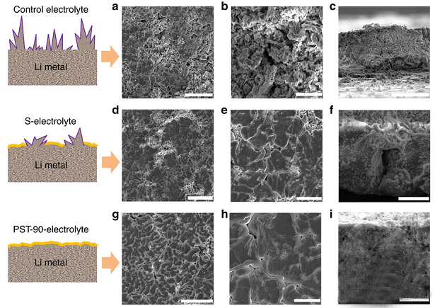 (g–i) 在PST-90的電解質(zhì)中沉積在裸露的不銹鋼襯底上的金屬Li的SEM圖;