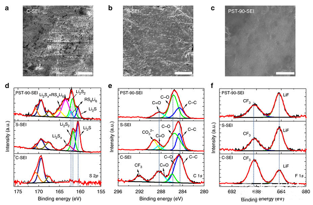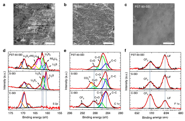 d)從不同電解質(zhì)中形成的SEI膜的S 2p XPS光譜;