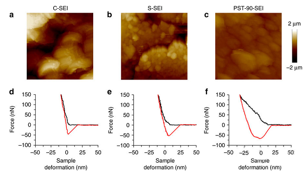 圖4. 由不同的電解質(zhì)形成的SEI層的表面形態(tài)和機械性能