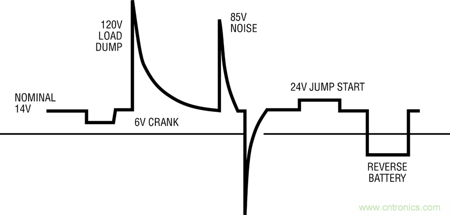 交通運(yùn)輸系統(tǒng)的輸入電壓可能高達(dá) 14V (單電池供電汽車)、28V (雙電池供電卡車、客車和飛機(jī))、或更高電壓,而其數(shù)字系統(tǒng)需要一個(gè)或更多個(gè)低壓軌。因此,設(shè)計(jì)這類系統(tǒng)時(shí),需要了解怎樣才能簡便、高效和可靠地從很高的輸入電壓降壓。以下圖 1 顯示,汽車環(huán)境中的輸入電壓可能視其運(yùn)行狀態(tài)的改變而改變,而其運(yùn)行狀態(tài)可能包括負(fù)載突降變化到冷車發(fā)動(dòng)的各種情況,甚至出現(xiàn)電池反向連接。