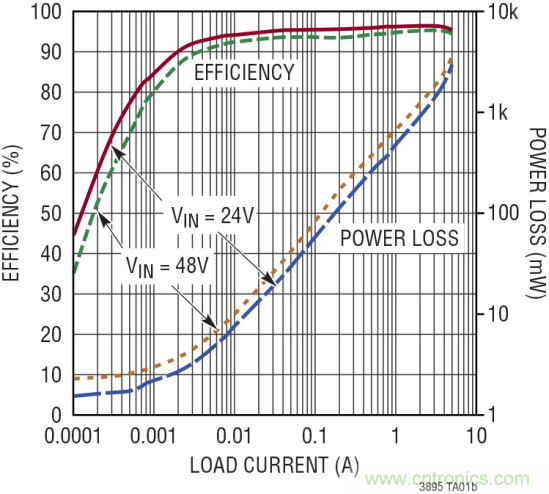 圖 2:LTC3895 原理圖以及效率隨功率損耗變化的曲線