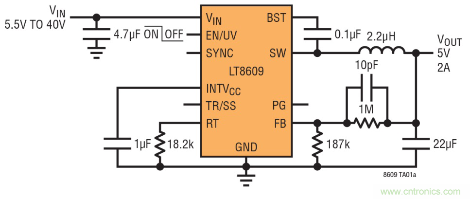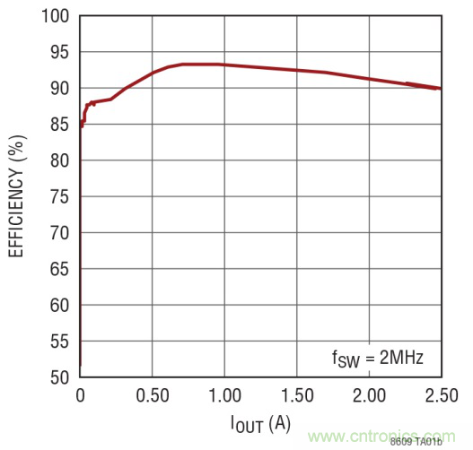 一個(gè)很好的例子是 LT8609,這是一款 2A、42V 輸入同步降壓型開關(guān)穩(wěn)壓器。獨(dú)特的同步整流拓?fù)涮峁?93% 的效率,而以 2MHz 頻率切換使設(shè)計(jì)師能夠避開關(guān)鍵噪聲敏感頻段,例如 AM 無線電,同時(shí)可提供占板面積非常緊湊的解決方案。突發(fā)模式 (Burst Mode®) 運(yùn)行在無負(fù)載備用情況下保持靜態(tài)電流低于 2.5μA,從而使該器件非常適合始終保持接通的系統(tǒng)。LT8609 的 3.0V 至 42V 輸入電壓范圍使其非常適合汽車應(yīng)用,這類應(yīng)用必須以低至 3.0V 的最低輸入電壓穩(wěn)定通過冷車發(fā)動(dòng)和停-啟情況,并穩(wěn)定通過超過 40V 的負(fù)載瞬態(tài)。其內(nèi)部 3.5A 開關(guān)可在峰值負(fù)載電流為 3A 時(shí),提供高達(dá) 2A 的連續(xù)輸出電流。原理圖和相應(yīng)于 2MHz 切換頻率的效率曲線如圖 3 所示。