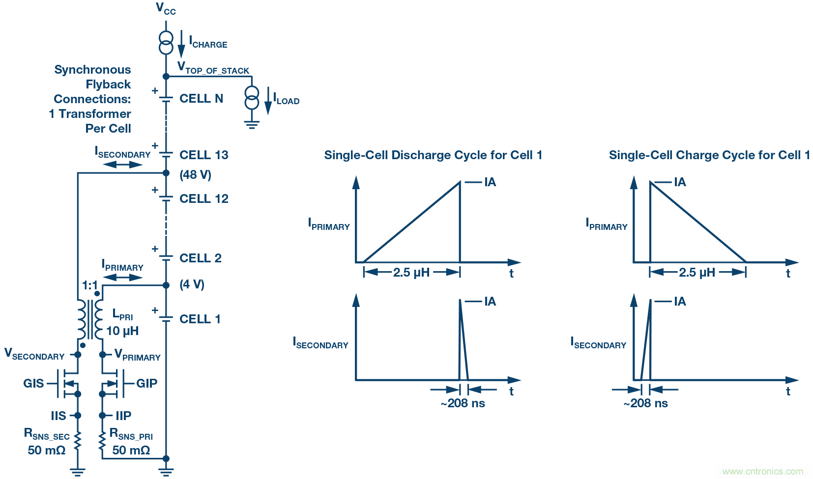 變壓器。每個(gè)變壓器的原邊連接在要均衡的電池單元兩端,副邊連接在12個(gè)或更多的相鄰電池單元上,包括要均衡的電池單元。副邊的電池單元數(shù)量僅受外部器件的擊穿電壓限制。電池單元的充電和放電電流由外部檢測電阻結(jié)合相應(yīng)的外部開關(guān)和變壓器調(diào)整來設(shè)置,最高達(dá)到10 A以上。高效率是通過同步操作和適當(dāng)?shù)钠骷x擇來實(shí)現(xiàn)的。各均衡器通過BMS系統(tǒng)處理器使能,并且保持使能狀態(tài),直到BMS命令均衡停止或檢測到故障狀態(tài)。 均衡器效率問題