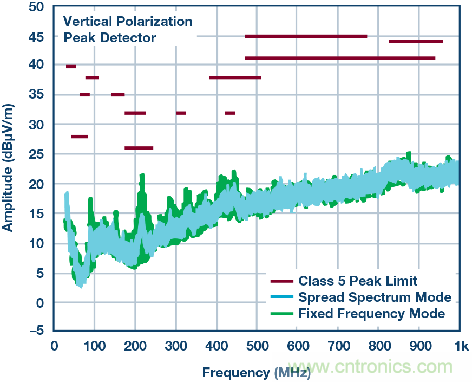 在整個負載范圍內,LT8645S可以輕松符合汽車CISPR25、Class 5峰值EMI限制。還可以使用擴頻頻率調制進一步降低EMI水平(圖2)。LT8645S內置高效率頂部和底部功率開關,并將必要的升壓二極管、振蕩器以及控制和邏輯電路集成到單個芯片中。低紋波突發工作模式可在低輸出電流下保持高效率,同時使輸出紋波低于10 mV p-p。最后,LT8645S采用小尺寸散熱增強型4 mm×6 mm、32引腳LQFN封裝。