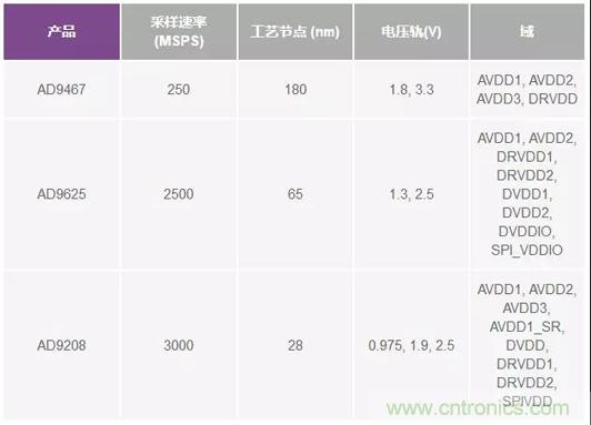 數(shù)字電路不需要裕量,因為最重要的參數(shù)是速度。所以,數(shù)字電路通常以最低電源電壓運(yùn)行,以獲取CMOS開關(guān)速度和功耗的優(yōu)勢。這在新一代ADC中很明顯,最低電壓軌已降低至0.975 V。下面的表1列出了若干代的一些常見ADC。