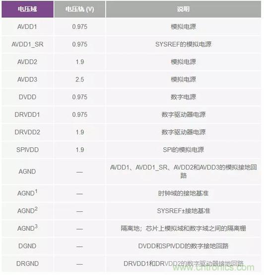 為了改善隔離,設(shè)計者必須考慮各種耦合機(jī)制。最明顯的機(jī)制是通過共享電源域。如果電源域盡可能遠(yuǎn)離電路,那么共享同一電壓軌(AD9208為0.975 V)的數(shù)字電路和模擬電路發(fā)生震顫的可能性將非常小。在硅片中,電源已被分開,接地也是如此。封裝設(shè)計繼續(xù)貫徹了這種隔離電源域處理。由此所得的同一封裝內(nèi)不同電源域和地的劃分,如表2所示,其以AD9208為例。
