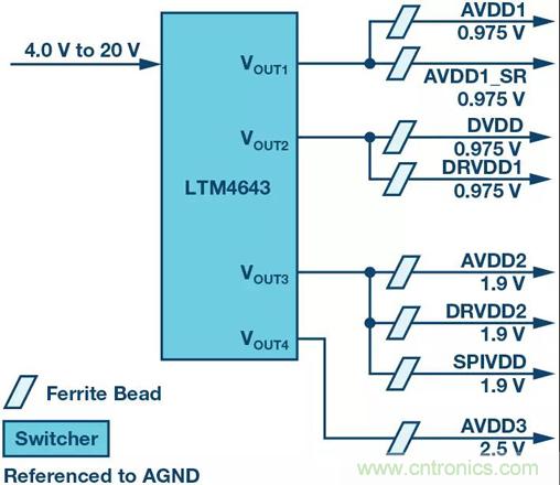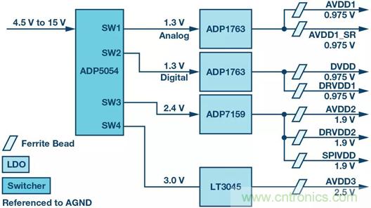 圖3. AD9208 PDN,DC-DC轉(zhuǎn)換器為所有域供電