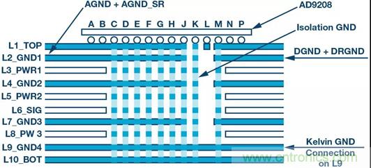 通過充分濾波和布局分離,各個域可以合理布置,使得ADC性能最大化,同時降低BOM和PDN復(fù)雜性。各接地域采用開爾文連接方法也會改善隔離。從網(wǎng)表角度來看,仍然只有一個GND網(wǎng)。電路板可以劃分為不同接地域以提供充分的隔離。在AD9208的評估板AD9208-3000EBZ中,不同接地分區(qū)在第9層上形成開爾文連接。圖4所示為10層PCB(印刷電路板)AD9208-3000EBZ的橫截面,其顯示了不同GND連接。