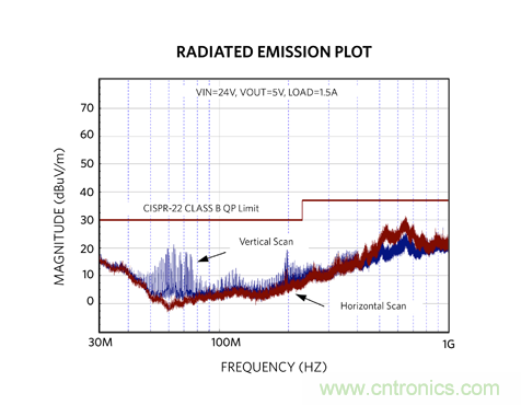 MAXM17575 本質上具有極低的輻射 EMI。對于輻射測試,傳導 EMI 測試中所示的輸入濾波器不需要也沒有使用。使用輸入濾波器能夠為輻射測試提供更大的裕量。