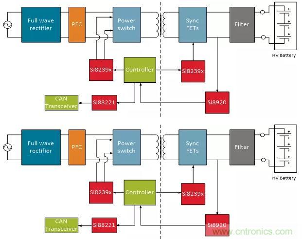 OBC系統(tǒng)采用交流輸入源,通過全波整流器將其轉(zhuǎn)換為高壓直流總線電壓,并提供功率因數(shù)校正(PFC)。產(chǎn)生的直流信號被斬波成開關(guān)方波,用于驅(qū)動變壓器以產(chǎn)生所需的直流輸出電壓。輸入信號的斬波由隔離柵極驅(qū)動器(例如Silicon Labs的Si8239x器件)完成。