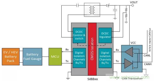 如圖3所示,這個簡化的BMS系統(tǒng)展示了在與一個EV子系統(tǒng)進行連接時信號和電源隔離的重要性。在大多數(shù)EV子系統(tǒng)中,CAN總線通過數(shù)字隔離與該子系統(tǒng)中的高壓隔離。現(xiàn)代數(shù)字隔離兩側(cè)各需要一個電源為隔離器供電(高壓域和低壓域)。該電源也可為連接到隔離器的其他設(shè)備供電,例如CAN總線收發(fā)器。