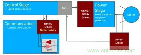 這些系統(tǒng)需要在馬達控制器和功率晶體管之間采用隔離驅(qū)動器。隔離允許低壓控制器安全地開關(guān)高功率晶體管以產(chǎn)生交流波形。此外,馬達控制系統(tǒng)中可能存在隔離的CAN總線,并且有某些方法可以感測驅(qū)動馬達的電流,以監(jiān)控速度和轉(zhuǎn)矩。圖4展示了一個使用一系列數(shù)字隔離設(shè)備的簡化的牽引馬達控制系統(tǒng)。