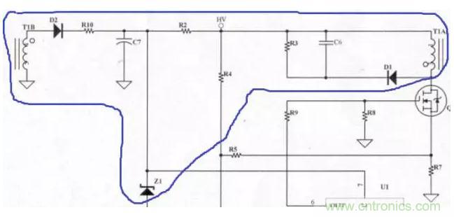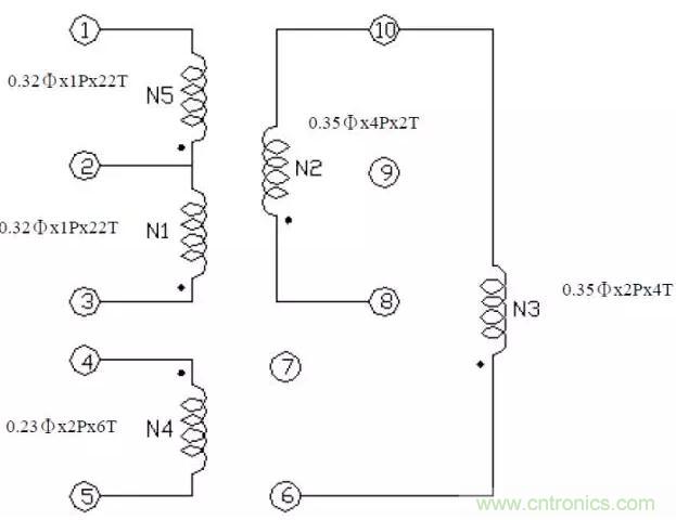 依據變壓器的圈比關系,可決定輔助電源的圈數及電壓。