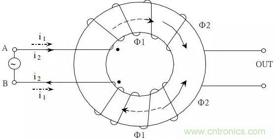 如圖所示,在同一磁環(huán)上繞上兩組方向相反的線圈,據(jù)右手螺旋管定則可知,當(dāng)在輸入端A、B兩端加上極性相反,信號(hào)幅值相同的差模電壓時(shí),有實(shí)線所示的電流i2,在磁芯中產(chǎn)生實(shí)線所示的磁通Φ2,只要保證兩繞組完全對(duì)稱,則磁芯中兩不同方向之磁通相互抵消。總磁通為零,線圈電感幾乎為零,對(duì)常模信號(hào)無阻抗作用。若在輸入端A、B兩端加上極性相同,幅值相等的共模信號(hào)時(shí),有虛線所示的電流i1,在磁芯中產(chǎn)生虛線所示的磁通Φ1,則磁芯中磁通有相同的方向而互相加強(qiáng),使每一線圈的電感值為單獨(dú)存在時(shí)的兩倍,而XL =ωL,因此,此一繞法的線圈對(duì)共模干擾有很強(qiáng)的抑制作用。