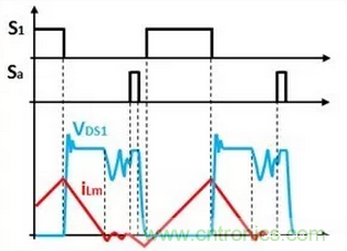 在主開關管開通前,先開通輔助繞組的開關管,輔助電源對輔助繞組進行電流反灌,將能量儲存在變壓器中;輔助繞組的開關管關斷后,變壓器儲存的能量抽取主開關管COSS的能量,COSS放電電壓降低,直到其內部體二極管導通,這時候開通主開關管,就能實現零電壓開通ZVS。