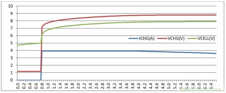 配合電量計芯片BQ28Z610,在BQ24725A的評估版上對雙節8.8V的對講機電池的第二次充電測試,記錄曲線如下圖所示,CC階段4A持續充電時間達到41分鐘,遠遠長過前一次測試的普通的充電方案。
