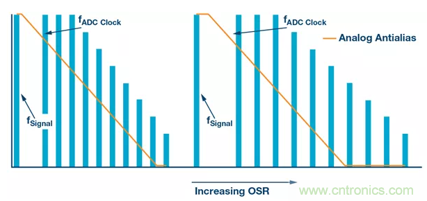 根據經驗,采樣頻率加倍可在原始信號帶寬下將信噪比(SNR)提高約3dB。在圖1所示的電路中,仍然在FPGA中應用數字濾波,以消除高于目標信號帶寬的噪聲。原理如圖2所示。