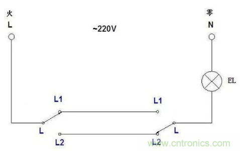 大家看這個接法,兩個單聯(lián)雙控的L1連一起接燈的控制線,兩個L2連一起接的是火線,燈接零線。這種接法也是很安全的,唯一的缺點(diǎn)就是費(fèi)線。