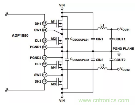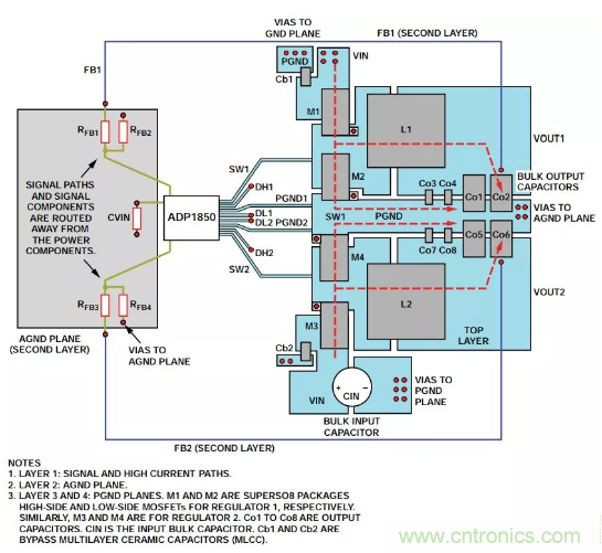 作為例子的開關調節器布局采用雙通道同步開關控制器 ADP1850,第一步是確定調節器的電流路徑。然后,進行物理規劃和電源器件的考慮。此外,我們需要了解一點:電流路徑決定了器件在該低噪聲布局布線設計中的位置。
