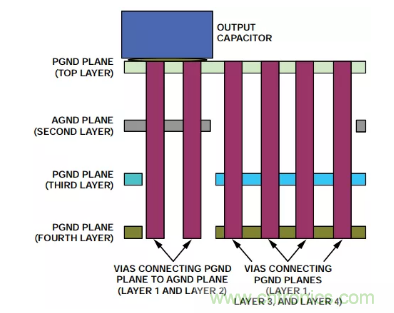 AGND層一路擴展到輸出電容,AGND層和PGND層在輸出電容的負端連接到過孔。