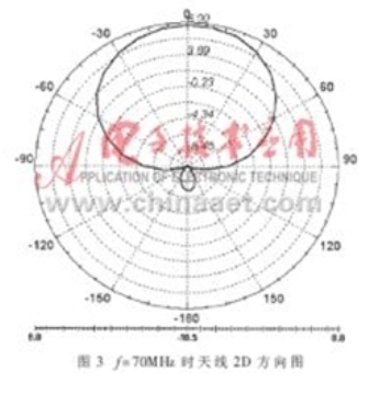 圖3為f=70MHz時天線的二維方向圖,從中可以看出,天線方向性系數達到7dB左右,而利用文獻中的圖表所查到方向性系數為6.5dB。圖4給出了幾個頻率下天線的二維方向圖,可以看出,各個頻率下方向圖形狀大致相同,但隨著頻率越靠近頻率范圍的上下限、方向圖背瓣越大。