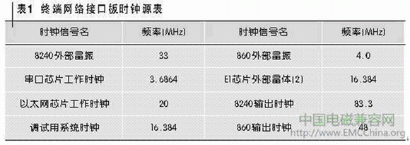 因?yàn)榻K端網(wǎng)絡(luò)接口板上沒有412.5 MHz和577.5 MHz這兩個(gè)頻率信號(hào),所以懷疑這兩個(gè)頻點(diǎn)可能是某些頻率信號(hào)的諧波分量。高速電路中,時(shí)鐘電流是第一輻射源。筆者對(duì)終端網(wǎng)絡(luò)接口板上的各時(shí)鐘信號(hào)進(jìn)行了統(tǒng)計(jì),如表1所示。