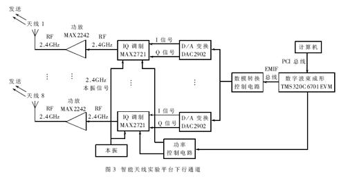 為了開(kāi)展智能天線技術(shù)研究,結(jié)合實(shí)際情況,筆者設(shè)計(jì)了一個(gè)基于TI公司TMS320C6701數(shù)字信號(hào)處理器的智能天線實(shí)驗(yàn)平臺(tái)。該平臺(tái)采用8單元天線陣列,工作頻率為2.4GHz,采樣速率為1.5MHz,采用TI公司的TMS320C6701EVM作為數(shù)字波束成形和控制算法實(shí)現(xiàn)單元,用于在實(shí)際信號(hào)環(huán)境下智能天線控制算法測(cè)試、MIMO技術(shù)研究和其他陣列信號(hào)處理技術(shù)的研究。實(shí)驗(yàn)平臺(tái)的上行通道如圖1所示,下行通道如圖3所示。
