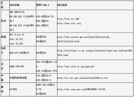 SRD無(wú)線(xiàn)系統(tǒng)的設(shè)計(jì)者在選擇無(wú)線(xiàn)通信頻率上需要格外小心。在大多數(shù)的情況下,此選擇被侷限于頻譜中容許免執(zhí)照使用的那些部份,而前提是必須符合使用上的特定規(guī)格與條件。表一所列為全球可使用的頻帶。
