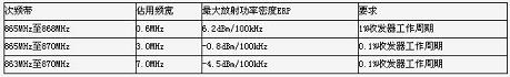 如表三所示,為使用FHSS時(shí),歐洲的擴(kuò)展頻帶上(低于870MHz)所需要的頻道數(shù)量、有效發(fā)射功率(ERP)、及工作週期。當(dāng)符合"說(shuō)前先聽(tīng)(listen-before-talk,LBT)"或是工作週期有效率限制值時(shí),便可有高達(dá)7MHz的頻寬可供使用,以往則只有2MHz的范圍。