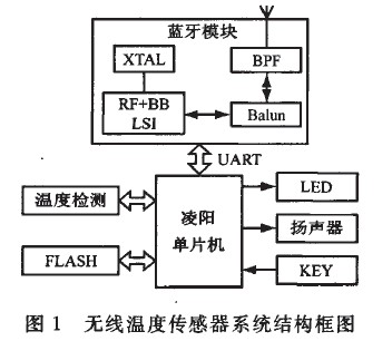 無線溫度傳感器主要由單片機控制單元、藍牙模塊、溫度檢測單元、接口電路及其它輔助電路組成,系統結構如圖1所示??刂茊卧桕枂纹瑱C為整個系統的核心,對檢測到的溫度數據進行轉換、顯示、傳輸,外擴4MBFLASH用于存儲程序和溫度數據。藍牙模塊包括藍牙芯片、放大器、非平衡變壓器(Balun)等,負責與藍牙控制終端進行無線連接和數據傳輸,按鍵完成系統設置、復位等信息輸人,測量的溫度數據在傳輸到控制終端的同時在LED上顯示,并通過揚聲器定時語音播報當前溫度數據和超限報警。