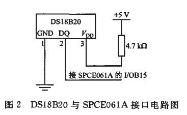 溫度檢測單元采用D1S8B02型傳感器,是美國DALLAS公司推出的一種改進型智能溫度傳感器,與傳統的熱敏電阻等測溫元件相比,它能直接讀出被測溫度,并且可根據實際要求通過編程實現9~12位的數字值讀數方式。DS18BZo與SPCEo61A單片機的接口電路如圖2所示,由于DS18B20傳感器支持“一線總線”接口,因此只需將DS18B20信號線接到單片機的1位1/0線上即可,而且在1根1/0線上可以掛接多個傳感器實現多點溫度測量。