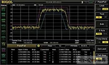 對于問題三可以利用DSA1030A頻譜分析儀中的Pass/Fail功能來解決。用戶根據實際的需求提前編輯好兩條標準跡線即測量的上限和下限,開啟該功能后會對測量結果進行統計通過率。在測量失敗的時候會自動停止測量,查看測量失敗的頻率和幅度。如圖3所示,利用Pass/Fail功能監控信號的大小。