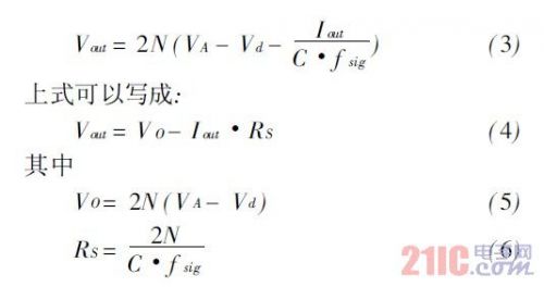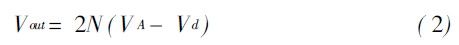 RFin正半周期時,節(jié)點1的最大電壓為VA+(VA-Vd)。該電壓使得M1導通,C2充電,直到C2兩端達到最大電壓,即節(jié)點2的最大電壓,為VA+(VA- Vd)-Vd=2(VA-Vd)。依次類推,C3兩端能夠獲得的最大電壓為3(VA-Vd),節(jié)點4的最大電壓為4(VA-Vd)。節(jié)點2N的最大電壓為 2N(VA-Vd)。于是,對于2N級電路,輸出直流電壓為: