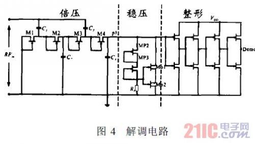 解調(diào)電路如圖4所示。M1~M4 為4級倍壓單元,起到檢波二極管的作用。由于并聯(lián)穩(wěn)壓電路的瀉流管無法瞬間關(guān)斷,因此,在OOK信號關(guān)斷時刻,瀉流管抽取電容C4上的電荷。電容C4取值較小,因此,p1點電平迅速下降,形成較大的下脈沖凹陷,經(jīng)過后級的整形電路,輸出標準的解調(diào)波形。