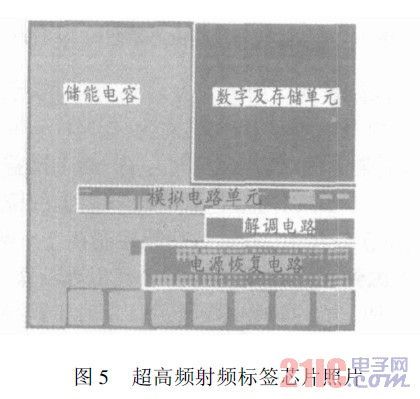 該射頻前端模塊作為超高頻長距離無源射頻標簽芯片的一部分,在UMC0.18m混合信號工藝下設(shè)計實現(xiàn),并流片驗證。芯片照片如圖5所示。