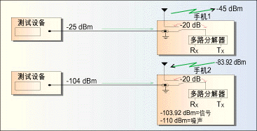 收器前端元件(下轉換器和放大器)的噪聲也會產生Nt,影響手機靈敏度,即正向鏈路功率測試級所達到的-104dBm規定靈敏度水平。另外其它所有噪聲因素都會提高Nt,同時影響靈敏度測試的成功。與處于性能指標邊緣的手機比較,具有一定容差的手機有更大空間容納增加的噪聲。