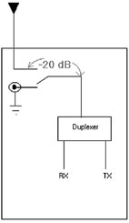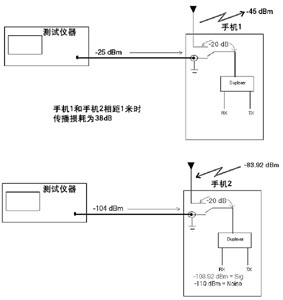 假設在最壞情況下,手機1距離手機2 1米遠(假定只有遠場效應,近場因素很難考慮),將兩個手機平行對準且手機之間沒有衰減材料,則手機2的天線會收到一個高達-83.92dBm的信號。這樣手機2的接收器就會有-103.92dBm干擾信號,因為假設天線到過電開關的衰減為20dB。這個例子說明了一個手機在另一手機接收信道上產生噪聲的一般原因,根據例中所做假設,在實際執行中還有很多情況會引起不同的結果,這也為認識哪種噪聲會從一個手機進入另一個手機信道提供了基礎。方位、距離、開關衰減、屏蔽、天線設計和實現方式等,這些因素都會在引入噪聲的整個轉換中發揮作用。
