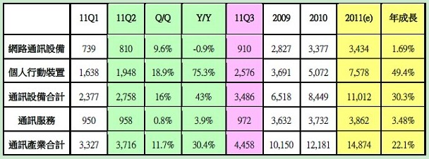 其中個人行動裝置市場仍是以手機產品為主要成長動能,而第二季起廠商開始推出雙核心或不同作業系統之產品來吸引消費者。因此整體通訊設備產業在 2011年第二季之產值為2,758億新臺幣,較2011年第一季成長16%,較2010年第二季成長約43%。