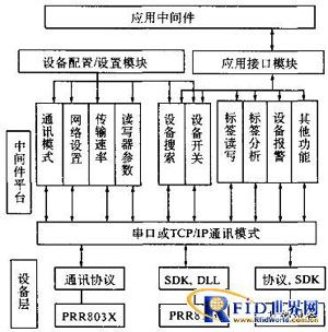 RFID技術的基本工作原理是:標簽進入磁場后,接收讀寫器發(fā)出的射頻信號,憑借感應電流所獲得的能量發(fā)送出存儲在芯片中的產品信息(Passive Tag,無源標簽或被動標簽),或者主動發(fā)送某一頻率的信號(Active Tag,有源標簽或主動標簽):讀寫器讀取信息并解碼后,送至中央信息系統(tǒng)進行有關數(shù)據(jù)處理。中間件是介于應用系統(tǒng)和系統(tǒng)軟件之間的一類軟件,它使用系統(tǒng)軟件所提供的基礎服務,銜接網(wǎng)絡上應用系統(tǒng)的各個部分或不同的應用,以達到資源共享、功能共享的目的.在具體實現(xiàn)上,中間件是一個用API定義的軟件層,具有強大的通信能力和良好的可擴展性。