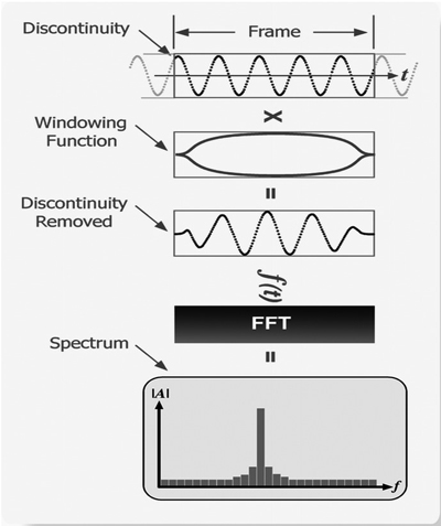上一層是幀,幀由整數個連續樣點組成,是可以應用快速傅立葉變換(FFT)把時域數據轉換到頻域中的基本單位。在這一過程中,每個幀產生一個頻域頻譜。