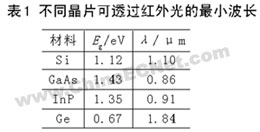 光波的近紅外部分(波長約0.75~1.5 μm)可以透過晶片,不同的晶片對紅外光的透射率不同。晶片可以透過的紅外光的最小波長如表1所示。