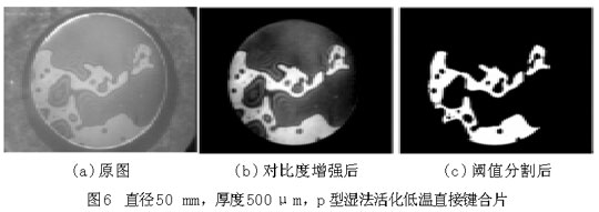 圖6(a)和圖7(a)中,圓形區(qū)域是要鍵合的圓片,其中明區(qū)為鍵合上的地方,暗區(qū)為未鍵合上的地方,圓形區(qū)域(即鍵合圓片)以外為圖像背景。從圖上可以大致地看出空洞(未鍵合區(qū)域)的分布、個數(shù)和大小等。為了獲得更為準(zhǔn)確的數(shù)據(jù)信息,借助圖像處理程序?qū)D片(a)進行對比度增強、平滑、分割等一系列處理,可獲得圖(b),(c),從而得到鍵合率。樣品1的鍵合率為28.12%,鍵合率很低,并且從圖6中空洞的分布可以看出,樣品1鍵合得很不好。樣品2的鍵合率為66.12%。比較圖6和圖7,樣品2的鍵合質(zhì)量明顯優(yōu)于樣品1,可以說明鍵合圓片越薄,越容易鍵合。可以從平板理論理解這一鍵合現(xiàn)象,圓片越薄,界面表面能克服圓片翹曲貼合到一起所需要的力越小。