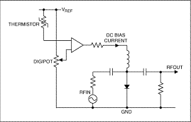 有些系統可能需要進行溫度補償(圖3),簡化電路中,數字電位器IC建立固定或可調偏置電平,熱敏電阻提供溫度輸入。這兩個輸入連接到運算放大器,產生的輸出通過一個電阻驅動PIN二極管。