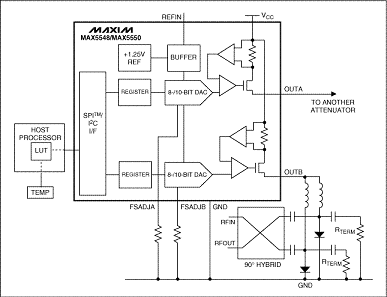 圖4. RF衰減器受電流輸出DAC (MAX5548或MAX5550)驅動,