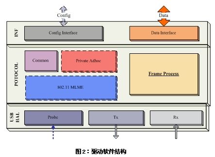 Nos-WiFi系列模塊產(chǎn)品是為了滿足工業(yè)應(yīng)用、安防監(jiān)控等領(lǐng)域中,現(xiàn)有產(chǎn)品的無線功能升級的需要而研發(fā)的,其最大的特點在于:它提供了一個不基于任何操作系統(tǒng)的驅(qū)動軟件,可以集成到任何的系統(tǒng)平臺中運行,并實現(xiàn)高速的數(shù)據(jù)傳輸,使得沒有操作系統(tǒng)也能使用WiFi進(jìn)行視頻傳輸成為可能。其驅(qū)動軟件結(jié)構(gòu)如圖2所示: