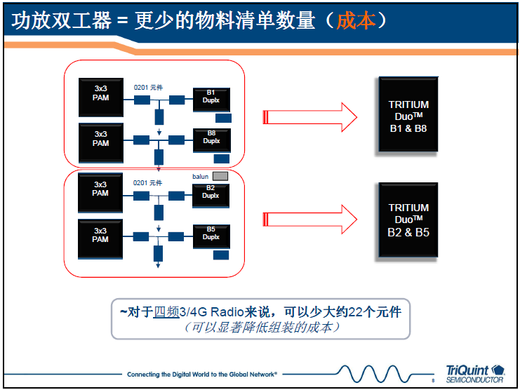 TriQuint中國區(qū)經(jīng)理熊挺介紹,一個(gè)更小、更靈活的解決方案可幫助工程師將更高質(zhì)量的產(chǎn)品以前所未有的更快速度推向市場(chǎng)。兩個(gè)TRITIUM DUO™模塊構(gòu)成的一個(gè)四頻解決方案尺寸僅為50平方毫米,是同等分立方案尺寸的一半,為3G/4G手機(jī)留下更多保貴的空間給其它應(yīng)用,比如增加更多功能或?qū)㈦姵刈龅酶蟆2⑶遥叨燃煞桨敢埠?jiǎn)化了設(shè)計(jì)。這款產(chǎn)品還將節(jié)省設(shè)計(jì)時(shí)間和資源。該產(chǎn)品具備的靈活性意味著生產(chǎn)速度會(huì)更快,需要的連接會(huì)更少,最終產(chǎn)生更高質(zhì)量的器件。