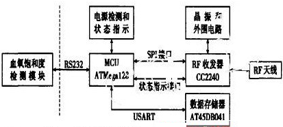 MCU部分是WPAN通信模塊的核心,完成通信模塊各組成部分的控制、協調和數據的加工。具體功能:通過RS232接口與血氧飽和度檢測模塊通信,實現對它的控制和配置,并接收檢測數據;通過SPI接口和狀態指示接口實現對RF收發器的配置和檢測,并完成發射和接收的數據交換;通過USART接口與數據存儲器連接,完成數據存儲器的讀寫操作;通過電源檢測和狀態指示部分,監測電源電壓情況,并能通過狀態指示產生報警提示。