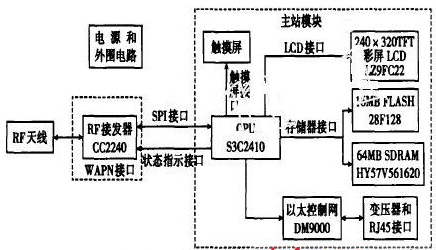 CPU部分完成主站各組成部分的控制、協調和數據的加工。具體功能:通過系統總線與存儲器相連,完成相關數據的加工、處理和存儲;通過LCD接口與彩色液晶顯示器相連,實現信息的顯示,以實現人機交互;通過觸摸屏接口與觸摸屏相連,實現控制命令的輸入;通過總線接口與以太網控制器相連,可將檢測儀接入后臺支持網絡,實現系統信息的集中化管理和與后臺管理系統的融合;通過SPI接口和狀態指示接口實現對RF收發器的配置和檢測,并完成發射和接收的數據交換,實現與檢測儀移動終端的通信;通過電源和外圍電路,實現對系統的供電。
