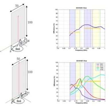 下面這個例子很好地說明了調諧方法在天線體積減小方面帶來的好處。這里用3D電磁建模程序分析兩種不同的天線配置:一種是寬帶設計;另一種是可以在相同頻率范圍內調諧,但使用了4個調諧狀態的窄帶設計。
